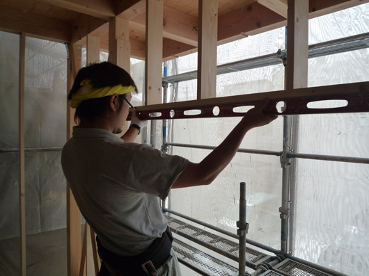 窓の下地を作るうえでまず最初にすることが窓の「墨つけ」です。この墨付けをしっかり行っておかないと窓が傾いてしまうので、細心の注意をはらいながら墨つけを行っていきます。